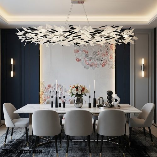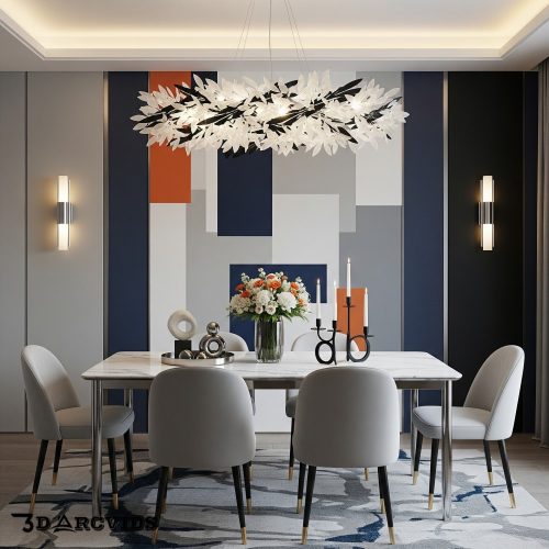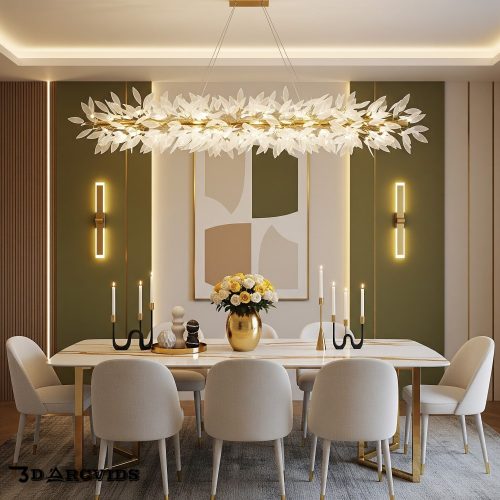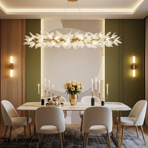 - هدف طراح: لوستر مستطیلی با طراحی مدرن و احتمالاً با الهام از فرمهای طبیعی (برگمانند)، به عنوان نقطه کانونی بالای میز ناهارخوری عمل میکند. این لوستر، علاوه بر تامین نور اصلی، به عنوان یک عنصر دکوراتیو چشمگیر نیز ایفای نقش میکند و با خطوط افقی خود، تعادلی با خطوط عمودی دیگر فضا ایجاد میکند.